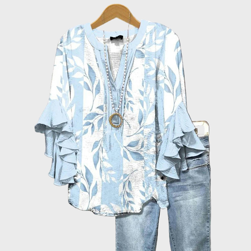 Osvježite svoj ljetni stil s ovom bluzom u plavoj nijansi, ukrašenom elegantnim bijelim listovima. Romantične detalje na rukavima s volanima dodaju pokret i ženstvenost, dok udoban kroj pruža lakoću i eleganciju za svaki trenutak dana.