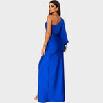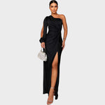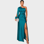 Ova večernja haljina odiše sofisticiranošću i modernim dizajnom. Asimetričan kroj s jednom rukavom i efektno nabrani detalj u struku ističu ženstvenu siluetu, dok duboki prorez dodaje dozu senzualnosti i elegancije. Idealna je za svečane prilike, gala večere ili posebne događaje na kojima želite zasjati i ostaviti nezaboravan dojam.
