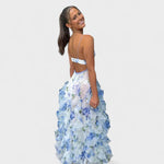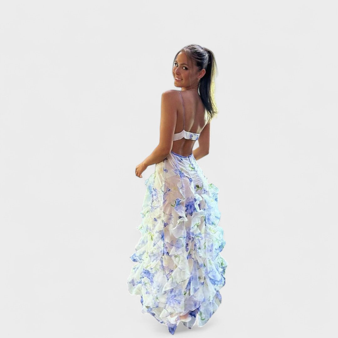 Ova duga cvjetna haljina s volanima unosi dašak sofisticiranosti i elegancije u svaku priliku. Zahvaljujući ženstvenom kroju i raskošnim detaljima, pruža besprijekoran balans između udobnosti i glamura. Idealna je za svečane prigode, proslave ili posebne trenutke kada želite zablistati.
