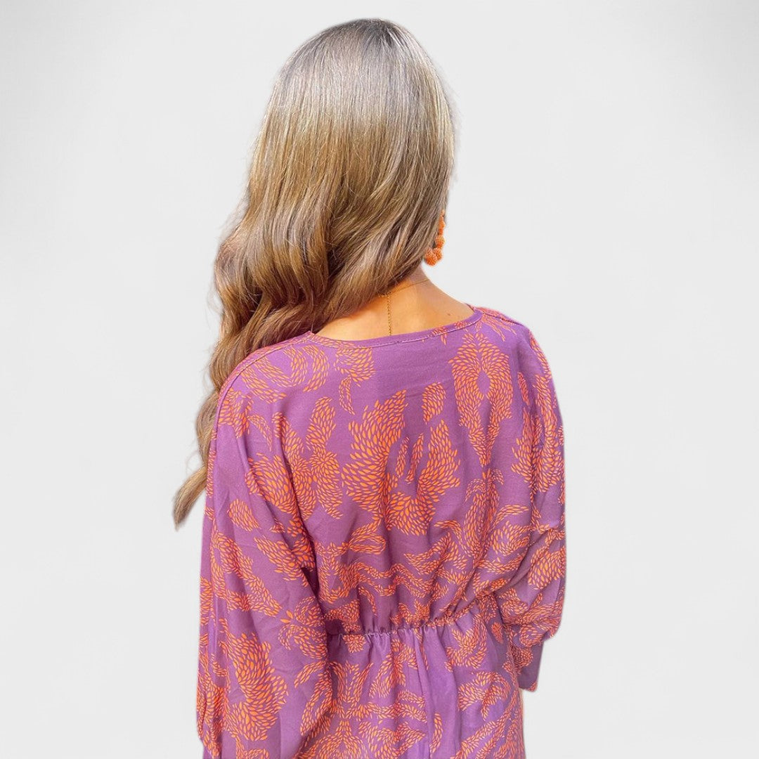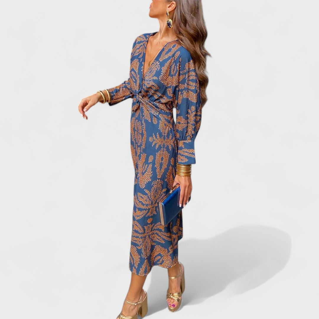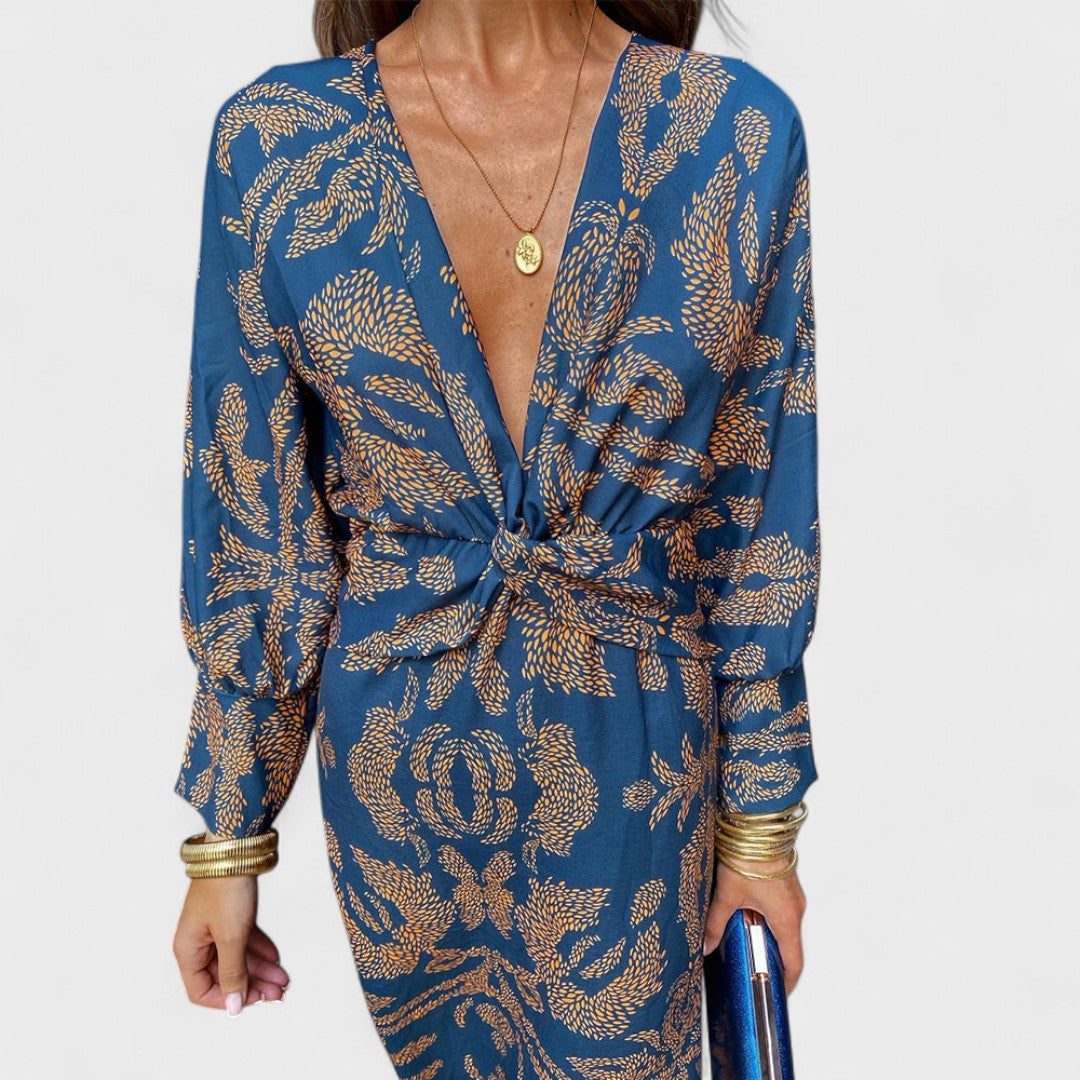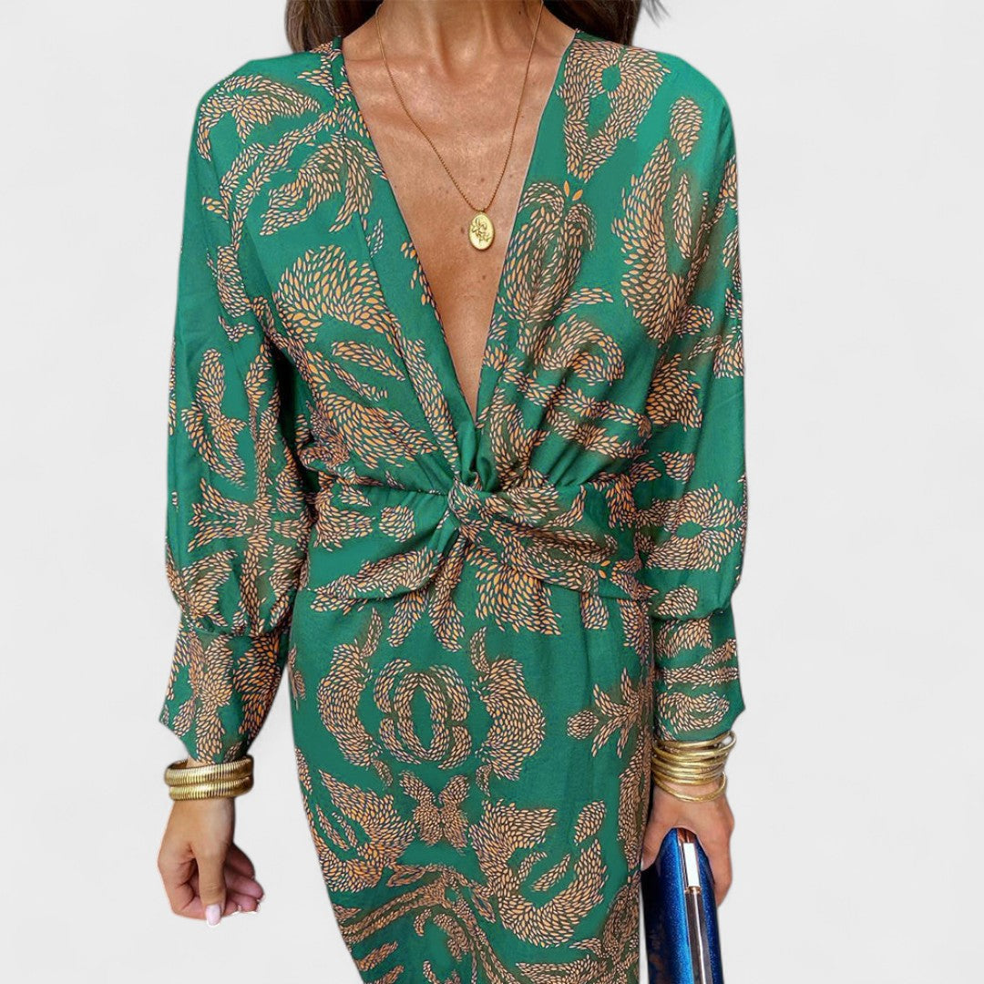 Ova haljina ističe se predivnim uzorkom i ženstvenim krojem koji naglašava struk. Dugi rukavi i duboki V-izrez daju joj sofisticiran izgled, dok lepršavi materijal pruža lakoću i udobnost. Idealna je za dnevne svečanosti, romantične večere ili ljetne događaje na otvorenom.