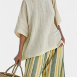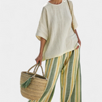 Prirodno, svježe i s morskim osjećajem. Daisy komplet u maslinastim i svijetlo žutim nijansama kombinira široku majicu od bambusovog lana s hlačama s vertikalnim prugama, nudeći opuštenu estetiku s elegantnim i svijetlim dodirom.